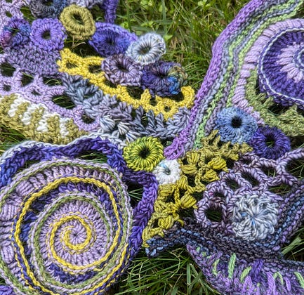 has finished her 21-day project of freeform crochet, and just look at the most gorgeous purples and greens!“And just like that, the 21 Day Project is over. The short time frame was very enjoyable for getting this project underway, for staying hyperfocused on using all of these greens and purples. My freeform project continues, but the 21 days have passed, so I’m working on my own leisurely schedule now.”
